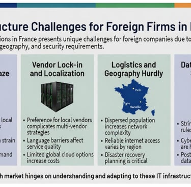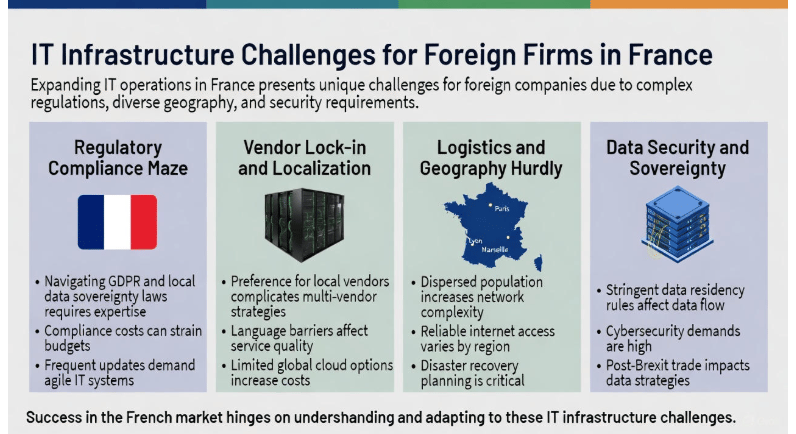 Expanding IT operations in France presents unique challenges for foreign companies due to complex regulations, diverse geography, and security requirements.